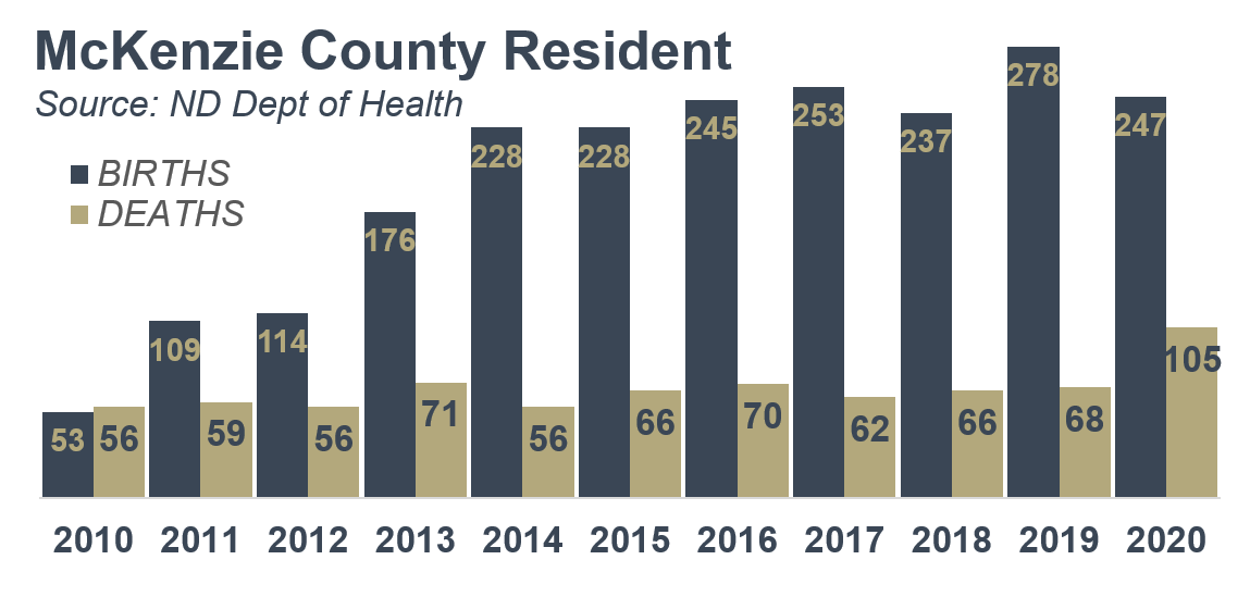 McKenzie County had 247 resident births and 105 resident deaths in 2020, according to data recently released by the North Dakota Department of Health Vital Statistics Division. That represents a decline in births from the all-time-high in 2019 where there were 278 births recorded. When compared to a decade ago in 2010 where there were 53 births and 56 deaths recorded.